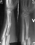 A female 30 y.o., right hand dominant, admitted at 4th post-injury day with a fracture of her left forearm. The forearm was fractured 7 years ago and treated non-operatively elsewhere.