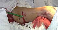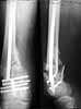 A mail 27 y.o. was operated Apr 2, 2002 2 weeks after injury (impact by a heavy construction) - he had open Gustilo II distal femoral fracture (image 1). Antegrade closed nailing by UFN 11 mm was performed (image 2). The second leg was amputated above the knee at the initial hosptial. To provide early weight bearing 6 mm locking screws were used so sll static holes were drilled accordingly. 2 months after the surgery he started to load the limb, before only knee ROM excersises were perfomed. The cyclic loadings produces stress riser and the nail was broken 10 days ago (image 3). Now he admitted to us again. It is the first case of such complication we meet. Now i plan to push the broken fragment distally and then perfrom retrograde nailing by UFN (distal femoral nails are not available in my settings). If the attempt would be too complicated we'll change to XF. Or plating is a good option here?