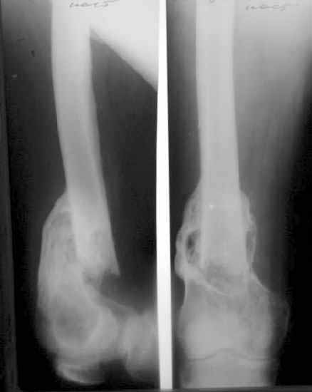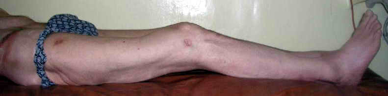 At the opposite side (right) there is femoral malunion, lack of full knee extension though the extremity is weight-bearable. Shortening is 3 cm.