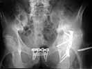 Referenced to us Mar. 25, 2003 - 4 months after the injury with healed femur, ankle and forearm. Pelvic external fixator was applied to correct the ring shape. Apr 28, 2003 the symphisys was plated and acetabular ORIF was performed mostly to prepare it for later THA.