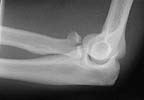 His pain returned and again could not move his forearm at all, stuck in neutral position. Repeat x-rays confirmed the suspicion that the fixation had failed and the fragment had displaced again. His pain at the DURJ has subsided.