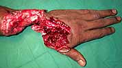 Severe bone loss. Thumb fracture. Missing most of wrist joint. terrible nerve injury. Tremendous soft tissue defect.