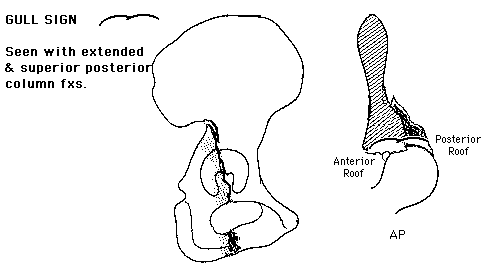 1: J Orthop Trauma. 2003 Oct;17(9):625-34. The "Gull Sign": a harbinger of failure for internal fixation of geriatric acetabular fractures. Anglen JO, Burd TA, Hendricks KJ, Harrison P. Department of Orthopaedic Surgery, University of Missouri Hospital and Clinics, Boone Orthopaedic Associates, 1601 East Broadway, Suite 300, Columbia, MO 65201, USA. anglenj@health.missouri.edu OBJECTIVES: To identify factors affecting the outcomes of surgery for acetabular fracture in patients over the age of 60 years. DESIGN: Retrospective review of records and radiographs; current examination, radiographs and outcome surveys when possible. SETTING: Academic, Level 1 trauma center. PATIENTS/PARTICIPANTS: Forty-eight patients over age 60 with displaced acetabulum fractures. INTERVENTION: Surgical reduction and fixation. MAIN OUTCOME MEASUREMENTS: Clinical ratings and radiographic evaluations, Short Musculoskeletal Functional Assessment survey (SMFA), SF-36, and hip-specific questions. Radiographs were evaluated using the criteria of Matta. RESULTS: Ten patients died since surgery. Four were lost to follow-up. Seven had >12 months of follow-up information in the chart. Twenty-seven had current evaluations for the study. Average follow-up was 37 months, range 1-114 months. The average age at surgery was 71.6 years (range 61-88). No perioperative deaths occurred. Initial reductions achieved: 61% anatomic, 34% imperfect, and 5% poor. A specific radiographic finding (superomedial dome impaction) predictive of failure was identified. This was designated the "Gull Sign." These patients had inadequate reduction, early fixation failure, or medial/superior joint narrowing and subluxation. Functional outcomes in patients with current examination were similar to age-matched controls. Radiographic outcomes: 30% excellent, 30% good, 9% fair, 23% poor, and 7% arthroplasty. Anatomic reduction was closely related to good or excellent radiographic result. CONCLUSIONS: While some patients over sixty years of age can have satisfactory functional outcomes after acetabular fracture fixation, a significant number will have failure of the procedure. Osteopenic patients with superomedial dome impaction (the Gull Sign) did not benefit from attempted open reduction and internal fixation in this series. PMID: 14574190 [PubMed - in process]![]()