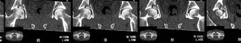 The CT scan confirms what the iliac oblique showed - the acetabulum is incongruous, and the femoral head is following the caudal piece medially. The other thing the femoral head is doing is grinding up against that displaced fracture. This is going to lead to erosion of the femoral head cartilage, and rapid onset of post-traumatic arthritis.