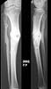 Xrays demonstrate that the medullary canal of the tibia has been obliterated in the vicinty of the fracture. It can be restored with sharp tipped intramedullary guide rods and end cutting reamers. This needs to be carefully done with fluoroscopic guidance.