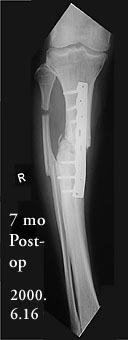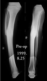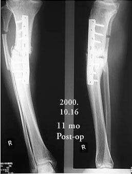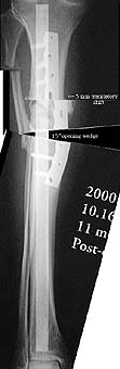 I am a 55-year-old male who suffered a compound fracture of the right tibia and fibula and extensive soft tissue damage, including vascular damage, from the impact of an automobile pinning the leg to a concrete wall in 1971. This occurred while I was a pedestrian. Emergency surgery restored circulation and set the tibia and fibula fragments with no internal fixation (due to concern about infection) and plaster cast immobilization. Later a bone graft was performed, and after physical therapy an apparently full recovery occurred, except a slight varus deformity, reduced vascularity, and reduced range of motion in the ankle. Over the years, the varus deformity worsened to 22 degrees and led to moderate osteoarthritis. To correct the deformity and straighten the tibia, an open-wedge osteotomy was performed in November 1999, with a bone graft from the other iliac crest. Plate fixation was used, as the bone was too hard to ream, so it was impossible to insert a pin. I have used the Exogen ultra-sound device every day since the surgery. Gradual improvement led to enhanced weight-bearing ability, and I have been walking with a cane since April 2000. Although X-rays taken June 16 showed no deformity, the varus deformity has recurred in the October 16 X-rays.