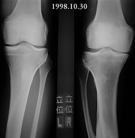 I am sending standing X-ray images of both knees for posting to the website. They show moderate osteoarthritis in the right knee and normal cartilage in the left knee. Knee pain was my initial complaint, and it was eventually diagnosed as resulting from the uneven pressure on the joint caused by the varus deformity. As to why the mild varus deformity of 1971 progressed to a 22-degree deformity in 1998, one answer I have received is that the 1971 fracture never healed properly.