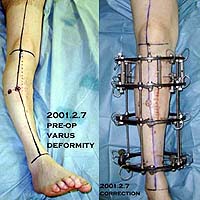 My 22-degree varus deformity of the tibia, the result of an earlier trauma injury, was corrected by Dr Tsuchiya and associates at Kanazawa University Hospital in Japan on February 7. Pre-op needle biopsy disclosed no infection around the fracture site. Bone scan tests with a radioisotope marker showed abundant blood flow around the fracture site. An Ilizarov frame mimicking the shape of the deformity was assembled based on the X-rays. All six screws of the former hardware, a titanium plate, were found to be loose. During surgery the tibia was found to be flexible enough to permit correction during the surgery. Bone graft material was harvested from the right iliac crest. A tissue culture of the plate from the previous, failed surgery revealed no infection. Antibiotic IV (Pansporin) was provided for five days, followed by oral Pansporin which continues. My temperature stabilized at normal within four or five days of the surgery, and there have been no signs of infection at the wire tracts. I started walking short distances three days after the surgery, and am currently undergoing physical therapy. The major limitations on my activity now are pain and stiffness, plus the usual post-op fatigue, but these are expected to diminish with time. The next step, of course, will be for regenerate to appear.