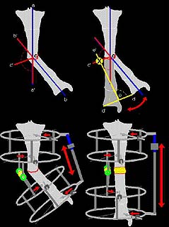 And no big deal what first will be performed - lenghthening or alignment, so device can be assembled with four rods with hinges at their both ends to allow angulation as well as longitudinal traction-compression. Also distraction speed can be different - 1 mm/day at the center of bone for normal bone structure, 0.25-0.5 mm/day with days off stands for sclerotic bone.
