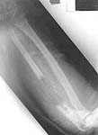 He is then put into an above elbow plaster and referred to our non union clinic. When seen now he is six months from initial injury unable to work and still wearing an above elbow POP . on exam out of POP: soft tissues fully healed no clinical infection no longer on antibiotics. wrist movements slight restricted but pain free pronation 10 degs supination 70 degrees elbow range 40 - 110 degrees pain free sensation normal Hand function normal except for Flexor pollicis longus not functioning 6 cm deficiency in ulna over to you for discussion.
