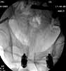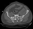 Was hemodynamic unstable at local ER, sent to our Trauma center where circumferential pelvic binder placed and pt. stabilized with fluid, blood, and rewarming. Angiography not performed. An extraperitoneal bladder disruption was found, uro elected to treat non-operatively. Initial xray (not shown) demonstrated 5-7 cm wide at symphysis and SI joint. The first image attached is of CT once binder is in place.