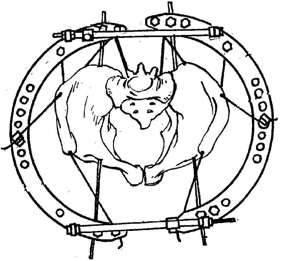 There are methodics with transiliac wires and circular frames. Despite there is no problem to insert the wires without abdominal perforations the frame is not stable enough to control motions in frontal plane (rotation of hemipelvis around AP axis). Though we used it for 3-4 years in late 80-s and early 90-s (see attached scheme).