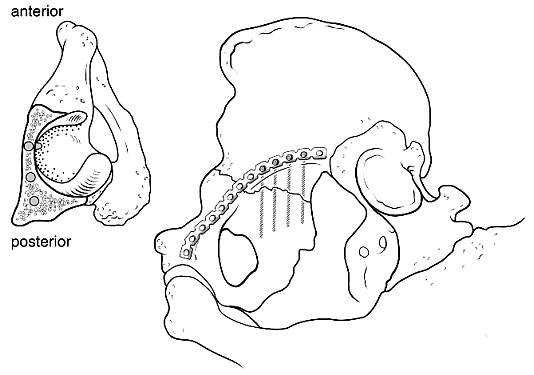 FIGURE 5: Placement of anterior to posterior screws through a plate for fixation of a transverse fracture exposed through an ilioinguinal approach. Screws placed closer to the ischial spine are less likely to result in inadvertent intra-articular placement (see inset). The margin for error in placement of screws in the quadrilateral surface medial to the acetabulum is small.