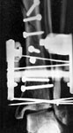 Treated by us with "minimal" internal fixation and application of a hybrid frame with 2 rings and wires around the metaphysis and 3 half pins in the diaphysis. Stable construct achieved. Tibial articular surface is well reconstructed-the lateral views are not included but show no articular steps or irregularity and the talus is well centred in the sagital plane.