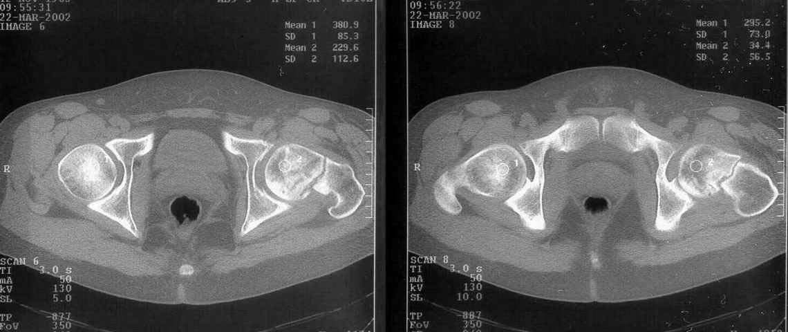 A miner 38 y.o. referred to us with 5 months old femoral neck lesion - after direct impact by a heavy construction he probably had non-displaced neck fracture. 3 months of spica cast, then non-weight-bearing. AP view and CT scan attached. Looks like AVN is present. ROM is painless and full, loading is also painless.