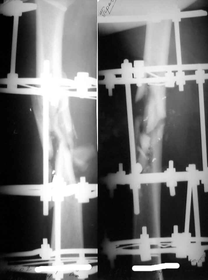Pin sites and the femur in general show no signs of infection. L- 5,1x10^9/l, ESR - 27 mm/hr. But 2 weeks ago he reported episode of hyperthermia 39 degrees and pain in the femur. After 2-3 days all signs disappeared with 5 days of i/m cefalexin.