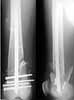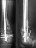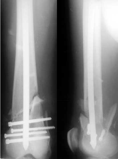 A mail 27 y.o. was operated Apr 2, 2002 2 weeks after injury (impact by a heavy construction) - he had open Gustilo II distal femoral fracture (image 1). Antegrade closed nailing by UFN 11 mm was performed (image 2). The second leg was amputated above the knee at the initial hosptial. To provide early weight bearing 6 mm locking screws were used so sll static holes were drilled accordingly. 2 months after the surgery he started to load the limb, before only knee ROM excersises were perfomed. The cyclic loadings produces stress riser and the nail was broken 10 days ago (image 3). Now he admitted to us again. It is the first case of such complication we meet. Now i plan to push the broken fragment distally and then perfrom retrograde nailing by UFN (distal femoral nails are not available in my settings). If the attempt would be too complicated we'll change to XF. Or plating is a good option here?