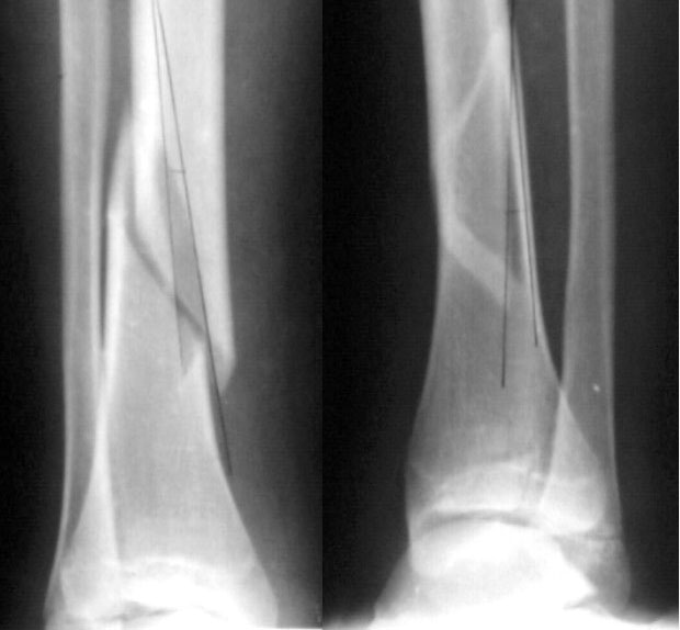 The injury films show an external torsional fx of the distal tibia - the typical triplane fx mechanism.