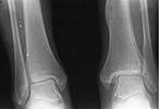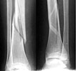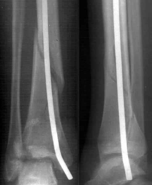 A female 14 y.o. sustained a spiral fracture of the distal tibia 1.5 years ago (Image 1). She was treated elsewhere by closed retrograde nailing with a thin nail (Image 2). The nail was removed after healing.