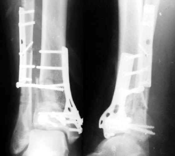 3. What is the status of the fixation? Is it solid or grossly loose? This appears somewhere in between with perhaps syndesmosis instability but the other fixation (fibula, tibia articular surface, tibia meta-diaphysis ?OK)
