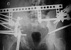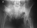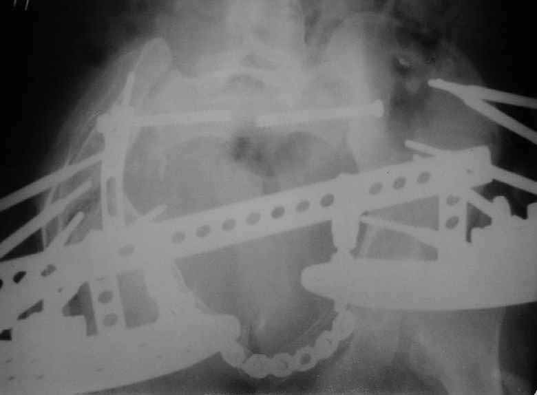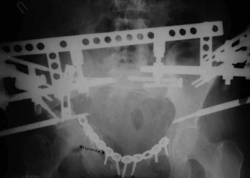 A female 27 years old admitted to our unit. Injured 18 month ago in a car accident. Initially the pelvis was fixed by anterior frame. 1 month later hardware was removed because of pin tract infection, and walk with cruches allowed. Also reptroperitoneal haematoma got infected.