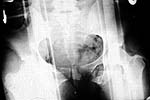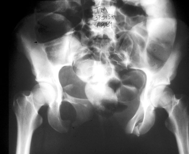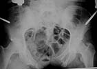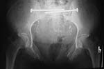 The patient sustained multiple injuries 11 months previously, including the pelvic ring disruption seen in the attached photos. The anterior injury was a fracture through the left pubis; the posterior lesion was a vertical fracture of the sacrum.