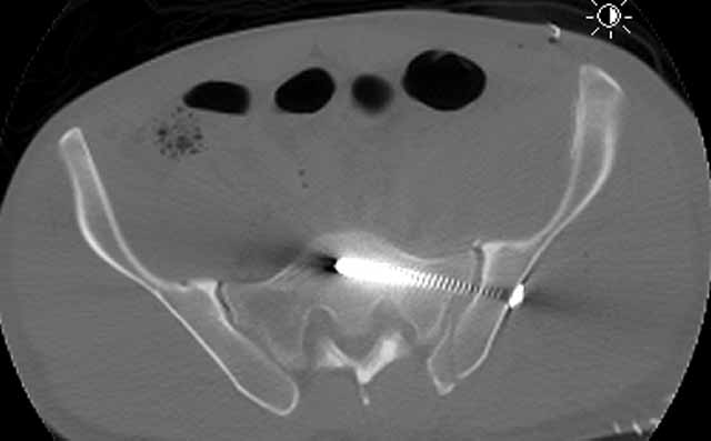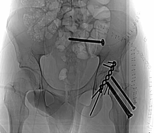 Two days later we returned to the OR and tried a closed manipulative reduction of the SI joint-iliac fracture but it failed, so we used the lateral (iliac) window of an ilioinguinal exposure to clean, reduce, and clamp the SI joint. We stabilized it with an iliosacral screw and closed.