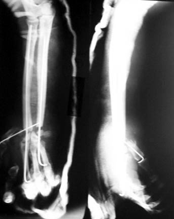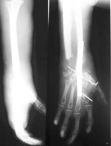 Shortened ulna and stabilised to hand using K wires. First metacarpal axially stabilised.
