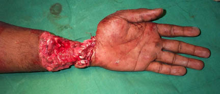 I am unsure of the warm ischemia time for this patient but from the clinical pictures I suspect he also had some amount of avulsion injury. This is a segmental problem at multiple sites: nerves bone and tendons. The soft tissue loss would not bother me because it is no problem with shortening and transfers- however his segmental loss of the flexors at the musculotendinous junction is a poor prognostic sign in light of all the other trauma. Median and ulnar nerve another bad sign. I have no idea of the patients social history or whether he would rather have a stiff insensate nonfunctioning hand rather than an amputation.
