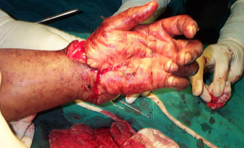 This is the case of an young adult involved in an industrial accident. Subtotal amputation with lots of tissue loss. Both radial and ulnar artery divided with loss of segments. Both median and ulnar nerves divided with loss of segments.All flexor tendons divided with loss of tissue. Extensors to thumb divided with loss of tissue. Extensor digitorum in continuity. Loss of segment of radius. Loss of carpal bones. Skin bridge on ulnar border intact with a collateral blood supply to hand. What will be the consensus? Amputation with early prosthesis or limb salvage with all the attended risks and prolonged and multi staged procedures with unpredictable outcome and finally a possibility of a cosmetic hand? Will be happy to know the views.