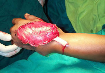 Primary anastomosis of vessels, tendons and nerves. Volar skin partially primarily closed and rest with a microvascular grascilus free flap to cover dorsolateral aspect. Split skin graft to cover the muscle.