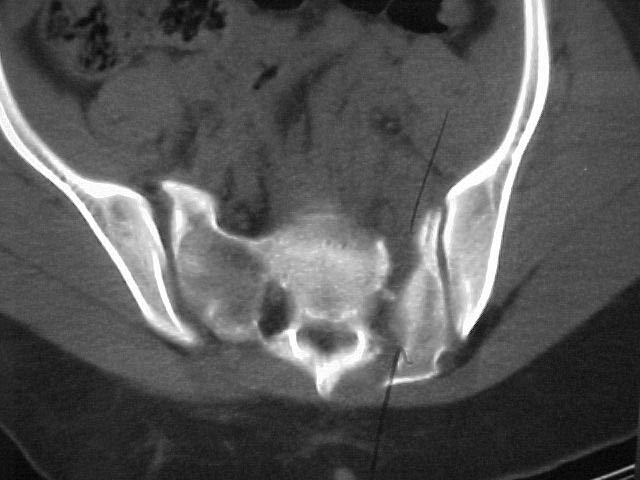 2. Posterior approach with open distraction, derotation reduction of Lt sacral (+/- foraminal decompression) fracture followed by posterior tension plate fixation (3.5 DCP bent over the PIIS) of both sides of pelvis...better idea with less risky approach to neural anatomy, but increased risk of posterior soft tissue irritation, infection, and prominent hardware.