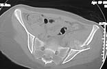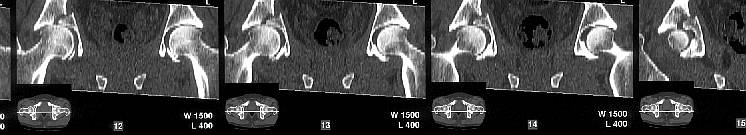 The CT scan confirms what the iliac oblique showed - the acetabulum is incongruous, and the femoral head is following the caudal piece medially. The other thing the femoral head is doing is grinding up against that displaced fracture. This is going to lead to erosion of the femoral head cartilage, and rapid onset of post-traumatic arthritis.