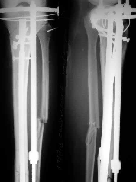 We applied Ilizarov frame, which was performing nice until 1 month ago when patient started to bear full weight. Yesterday patient presented to us. Gross Ilizarov frame instability and fracture movement was detected. Patient has minor pain in FWB, pins are infection free.