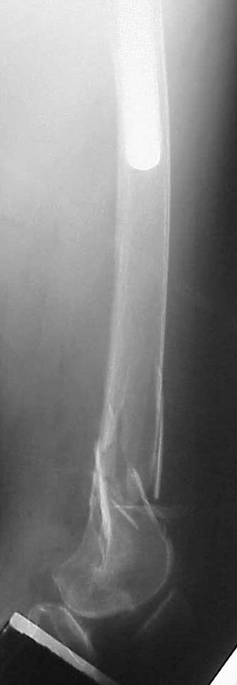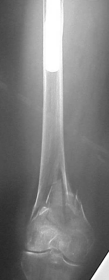 As Chip pointed out the injury was 4-7-01. No miracle, Chip, but her fixation w/ a LISS appears stable at 6 weeks w/ 0-90 knee motion. The proximal fixation is unicortical posterior to the prosthesis. Hope she continues to consolidate.