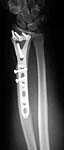 We have seen a few of these injuries that are difficult to stabilize w/ standard implants due to the shaft extension. I recently received a Synthes proto-type from Dr. Daniel Rikli in Aurau, Switzerland of the standard T-plate w/long proximal extension. It is a good implant for these unusual injuries. I wanted to get opinions on what others would do w/ standard implants. The plate takes 3.5 mm screws proximally and 3.5 or 2.7 screws distally. In a closed injury I imagine I would use the plate volarly, but due to the dorsal wound and lack of extensor tendons we plated the fx dorsally. I think we all should encourage Synthes to make these plates widely available.