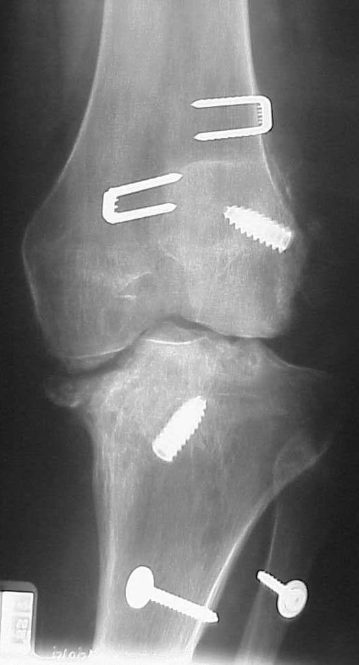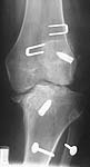 Did he have a medial tibial plateau fracture with the injury , or has the medial plateau eroded as a result of his gross varus thrust? No postero-lateral reconstruction will stay intact in the presence of such gross genu varus,and the ACL and PCL recontructions must not be intact to allow such a degree of subluxation.