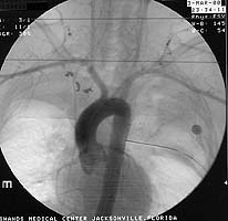Enclosed are three figures--the CXR of a male with a left to right transmediastinal GSW of upper chest--no hard signs of vascular injury except for about 1000 cc blood out of left chest tube which eventually stopped without surgery. Next is angio #1 showing intimal defect in innominate artery right at the takeoff of the Rt subclavian and carotids. F/U angio one week later--no surgery--documents complete resolution of the intimal injury. There were no symptoms, including the blood from the left chest, attributable to this injury, thus fulfilling the criteria for observation.