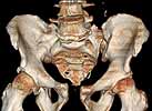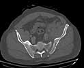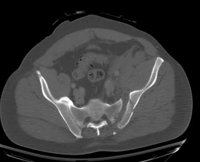 Was hemodynamic unstable at local ER, sent to our Trauma center where circumferential pelvic binder placed and pt. stabilized with fluid, blood, and rewarming. Angiography not performed. An extraperitoneal bladder disruption was found, uro elected to treat non-operatively. Initial xray (not shown) demonstrated 5-7 cm wide at symphysis and SI joint. The first image attached is of CT once binder is in place.