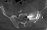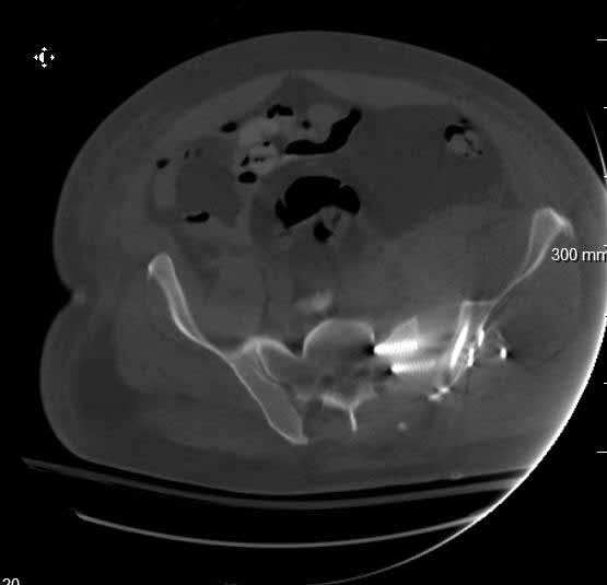 It appears from post-failure CT scan that the path of the more cephalad IS screw may be helpful to place a longer screw to engage opposite illiac wing as an option, or just anterior SI plates. not likely to do this tomorrow as he remains in a fragile clinical situation regarding his pulmonary status, and profound edema/induration around his pelvis/abdomen and thighs.