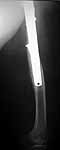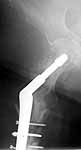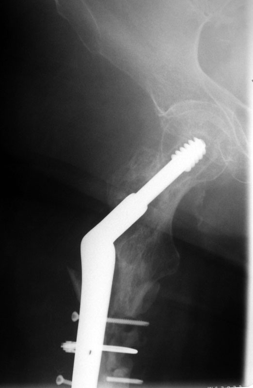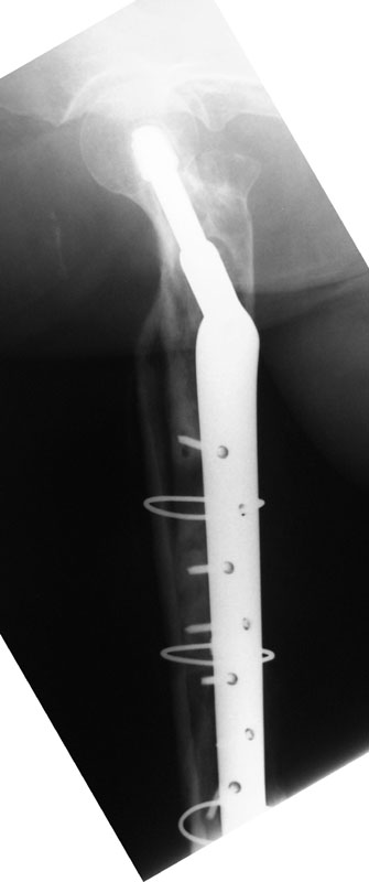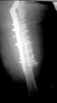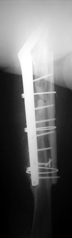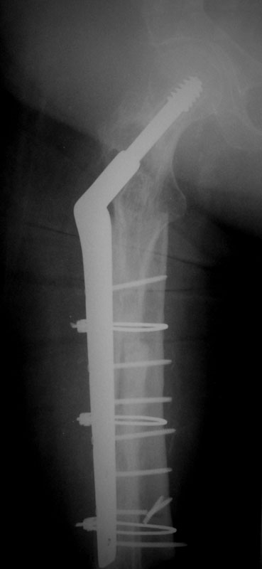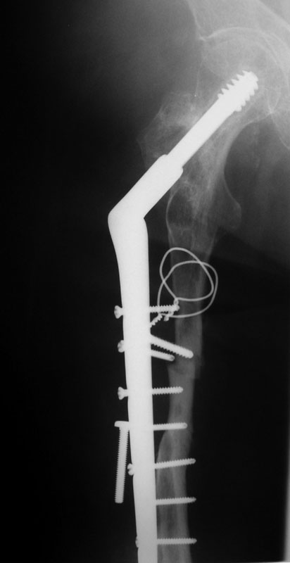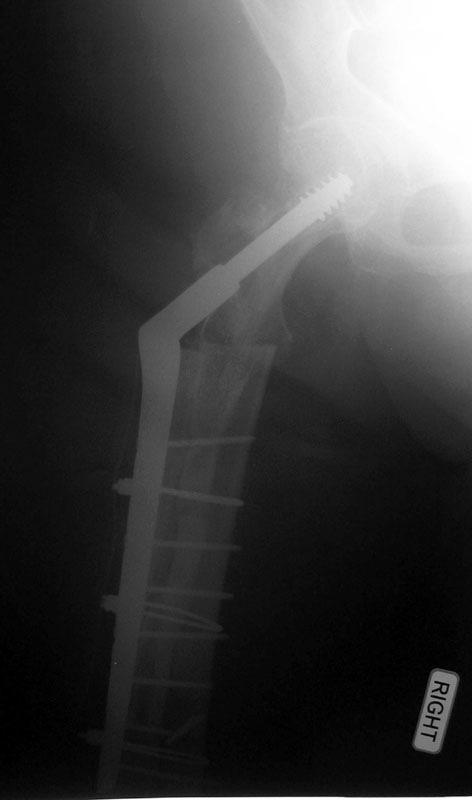 These are the Xrays of a 73 y/o women. The name of each file has the date it was taken and the view. These are all outside films and I know they are limited studies but I think the problem is evident. She had polio at age 5. 20 years ago she had a subtroch fracture plated with a DHS type implant. In Feb, 02 she presented to a local orthopod with a fracture under the plate. The hardware was loose at that time. The local orthopod kept the hardware and cabled allograft to the femur. She did well and was walking with only a cane or occ a walker until last month when she felt something was different and had some pain. She went to her orthopod who took the xrays in May. The orthopod sent her to me then. She has no motors of any significant function below the hip including lacking hip ext and flex. She has mild pain with rotational stress of the femur. She has a thick but not obese leg (she did grow up here in Wisconsin). She wears an AK brace on her leg. She has some pain but it s not too bad. She still can walk but does most of her ambulation with a wheelchair. She has little or no pain in the wheelchair. She is a 1 pack/ smoker for years. She has well controlled hypertension.