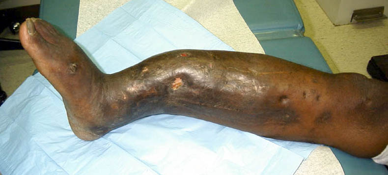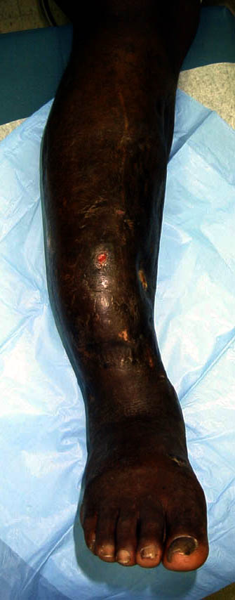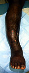 He now shows up in my clinic with pain and deformity as seen in the images. He has a draining sinus which drains on and off intermittently. He really wants to save his leg but i think an amputation will serve him best. He has a rigid ankle and midfoot. Currently his ankle is fixed in about 10 degrees of dorsiflexion. He ambulates with crutches because of his pain. He has sensation distally with good capillary refill, no palpable pulse. Angiogram shows all 3 vessels present in leg.