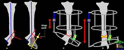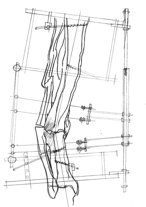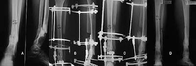 This is a 45 year old gentleman who 8 years ago sustained a midshaft tibia fracture originally treated with plate and screws which became infected. The plate and screws were removed, dead bone was resected and Ilizarov was placed with proximal corticotomy and transport into distal defect. Multiple complications during this including refracture and infection.