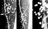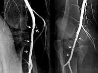 In a message dated 3/22/2003 2:18:50 PM Eastern Standard Time, SJASMD writes: This young man in his 20s sustained a shotgun wound to the thigh. Arteriography shows a mural hematoma. The five Ps were intact. He returned almost one year later, with a healed shotgun wound with a nonhealing heel ulcer resulting from the stricture of the SFA at the site of the intramural hematoma. Bypass was performed. Ulcer healed.
