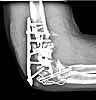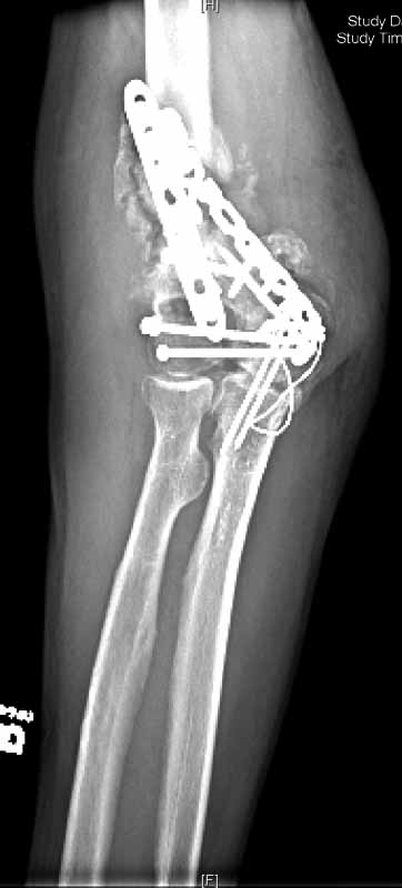 He was treated with IV antibiotics and no sign of infection was seen. After antibiotics were stopped, he still showed no sign of infection. He was offered a total elbow replacement which he refused since he has a handicapped child that he needs to care for, and he did not want to accept the lifting restrictions. He was offered an elbow fusion which he refused because he did not want the stiffness, but he did agree to fixation across the elbow without taking out the joint, even knowing that he would still have stiffness and even with later soft tissue release might not be any different than a fusion. The second revision including cross elbow fixation is in files (2nd revision).