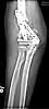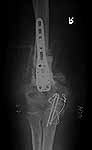 At surgery it appeared infected. Cultures eventually grew out strep viridans subcultured through broth. It was very hyperemic. I treated it with hardware removal, a spanning plate that was meant to provide temporary stability, and irrigation & debridement x 2. (I did not use an external fixator because of the osteoporosis, and the inability to get stability of the fragments.) An antibiotic impregnated cement spacer was added. Files( after I&D.) Last I&D was in March 2004.