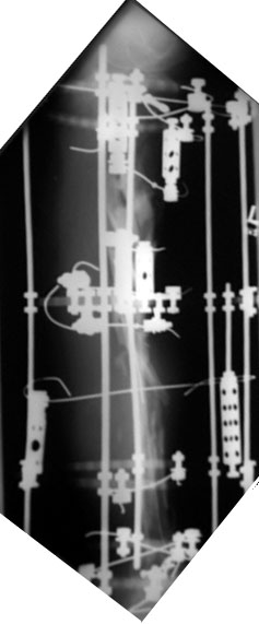 Patient is 30 yo male 9 months status post severely comminuted tibia fracture (plateau, shaft, plafond) treated with ring fixator and free flap. Soft tissue coverage good. 10 wks since last procedure (bone graft plus additional wires). The pin tracts are OK. Minimal callus.